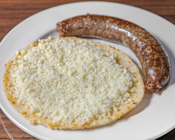 Homemade white corn cake topped with butter and white cheese served with homemade blood sausage.