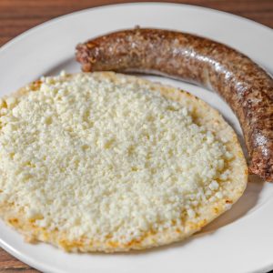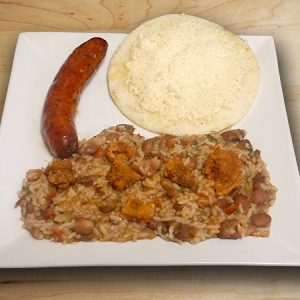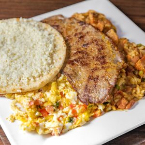 A mixture of white rice and red beans seasoned to perfection with onion and tomatoes, served with eggs to you choice (fried, scrambled, or scrambled with onions and tomatoes), pieces of pork rind on top, and our famous homemade corn cake topped with butter and white cheese