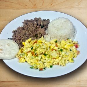 A mixture of white rice and red beans seasoned to perfection with onion and tomatoes, served with grilled chicken, pieces of pork rind on top, and our famous homemade corn cake topped with butter and white cheese