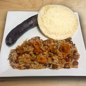 A corn cake filled with pork ribs, chicken, carrots, peas, potatoes, and small pieces of pork rind, all wrapped in a banana leaf. Served with your choice of white rice or small corn cakes.